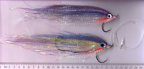 Različite verzije ovih mušica uvek nosim sa sobom, jer su izrazito lovne u morskom ribolovu. U neku ruku, one su mušičarski odgovor na svetlucave voblere tipa Yo-Zuri (naravno bez ugrađene akcije- za to iskoristite vašu maštu prilikom potezanja). Nisam imao prilike da ih isprobam u slatkovodnom ribolovu, ali verujem da bi bile dobre za štuku i druge grabljivice. Pri vezivanju bolje je dodati više svetlucavih materijala, koji se mogu lako odstraniti sa mušice ako njena šljaštavost plaši ribu (obrnuto je nemoguće). Evo i recepta za generalnu imitaciju juvenilnih salmonida (nazvao sam je ALF BABY SALMONID), gde se vidi kako slaganje boja funkcioniše: